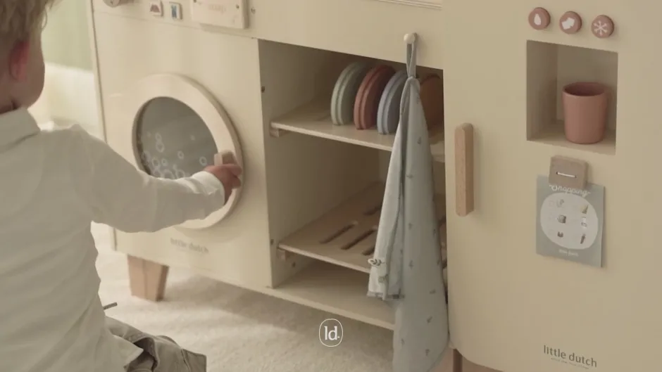 Con esta lavadora y lavavajillas de madera, las tareas del hogar se convierten en una auténtica aventura. El set incluye cuatro tazas, cuatro platitos, dos platos, detergente, pastillas de jabón y un paño de cocina. Lava los platos en el fregadero y lava la ropa de la muñeca en la lavadora. Los botones realistas con ilustraciones y el compartimento especial para la pastilla de jabón hacen que jugar sea aún más divertido. Combina la lavadora y el lavavajillas con la cocina de juguete y el frigorífico para crear un rincón de cocina completo. Diversión sin límites para los pequeños héroes del hogar.