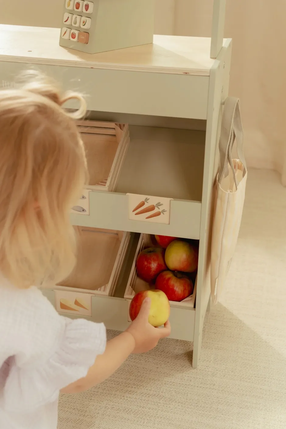 ¡Bienvenidos al mercado! Con este precioso puesto de madera, los niños pueden jugar a comprar en su propia tiendita. La marquesina de tela crea un auténtico ambiente de mercado, y con la pizarra y las tarjetas ilustradas, pueden exponer sus productos con estilo. El set también incluye una bolsa de la compra y cajas para una auténtica experiencia de compra. Dale la vuelta al puesto y se convierte en una cafetería, con menú y alegres ilustraciones. Combínalo con la caja registradora, la báscula o el expositor de pasteles para disfrutar aún más jugando. ¿Qué hay en el menú de hoy?