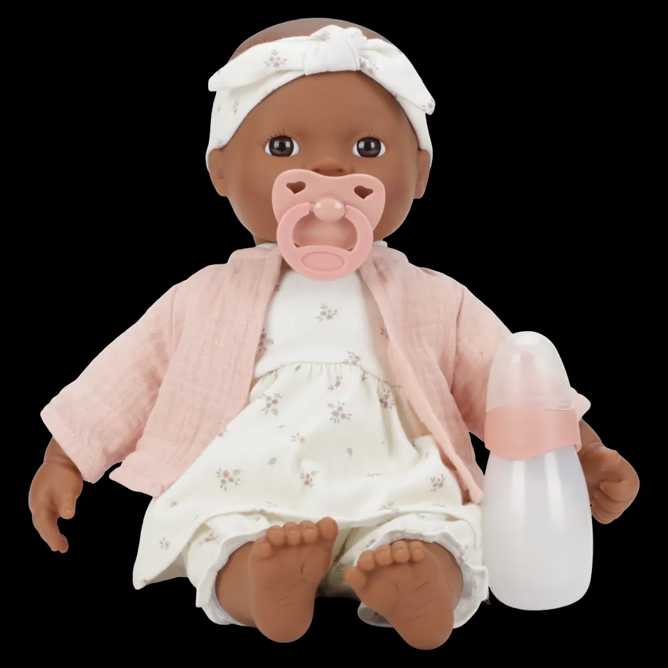 Conoce a la bebé Noa. Dale un abrazo y cuídala. Noa es una muñeca adorable y realista, con un cuerpo suave y mimoso, a la que le encanta que la quieran. Puedes cambiarle de ropa, ayudarla a dormir y calmarla con el chupete. Cuando tenga hambre, ofrécele el biberón de leche. A los niños les encanta imitar todo lo que hacen sus padres, y esta muñeca inspirará a su pequeño a participar en juegos de roles de crianza y cuidado. Noa está vestida con una diadema, un vestido y pantalones del diseño White Meadows, con un chaleco rosa suave.