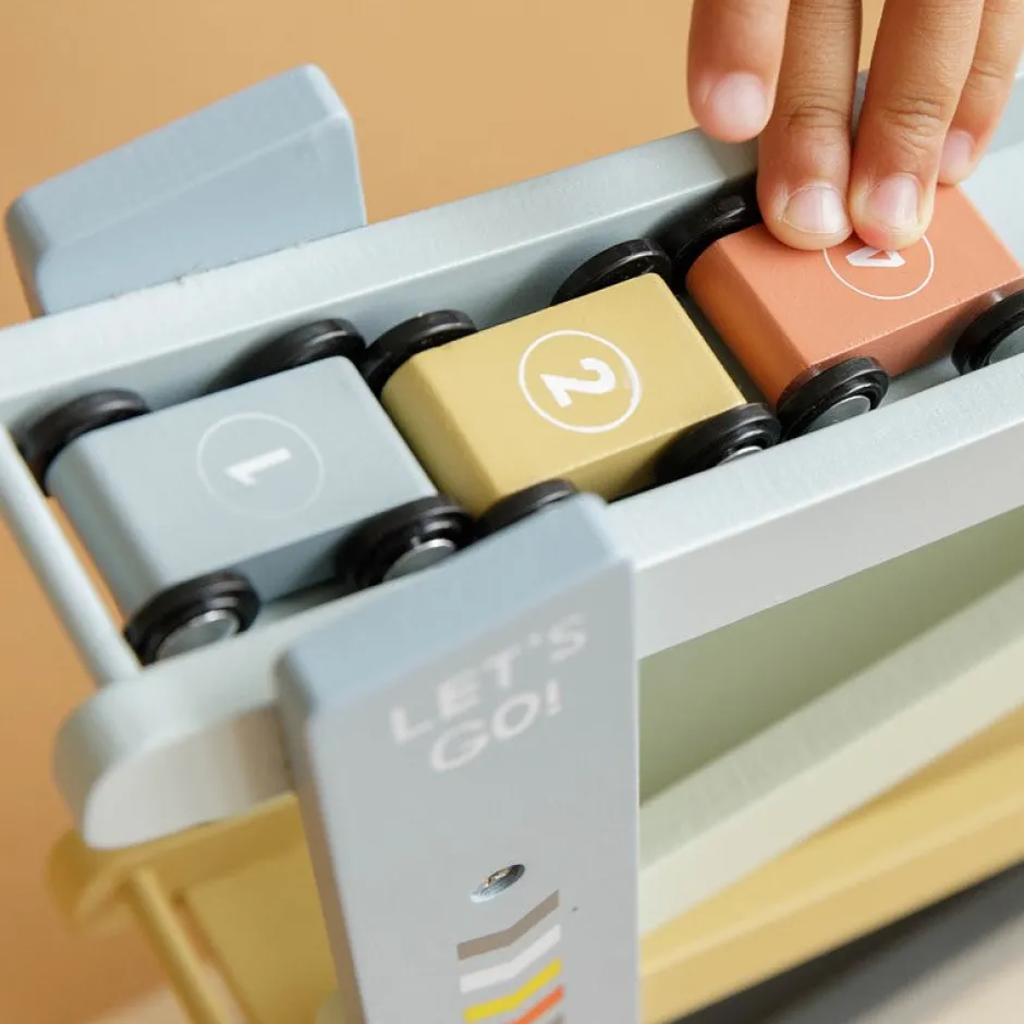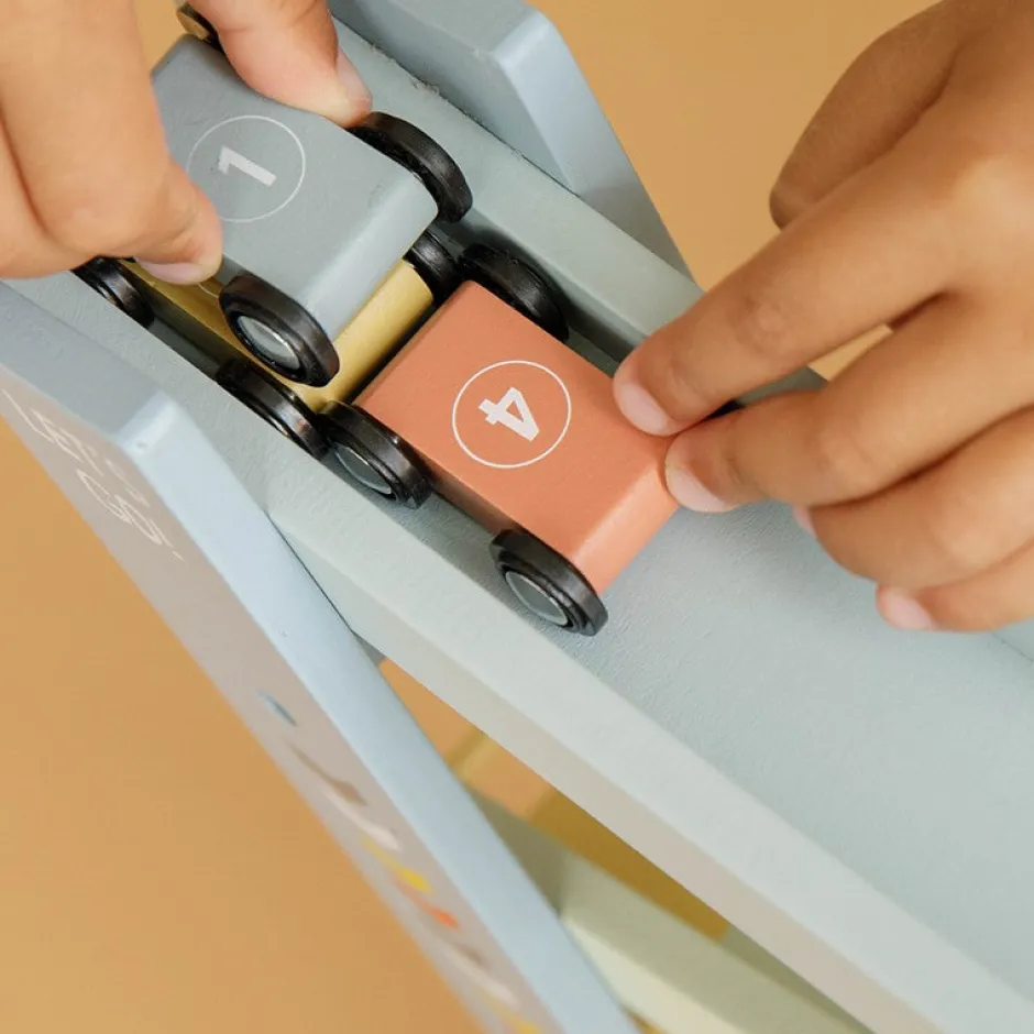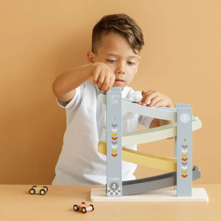 1, 2, 3 y ¡empieza! Con esta alegre rampa de carreras de madera que incluye 4 coches, tu pequeño se lo pasará en grande. Coloca los autos uno por uno en la parte superior de la pista de carreras, déjalos ir y correrán hacia abajo. ¡A los niños les encanta!