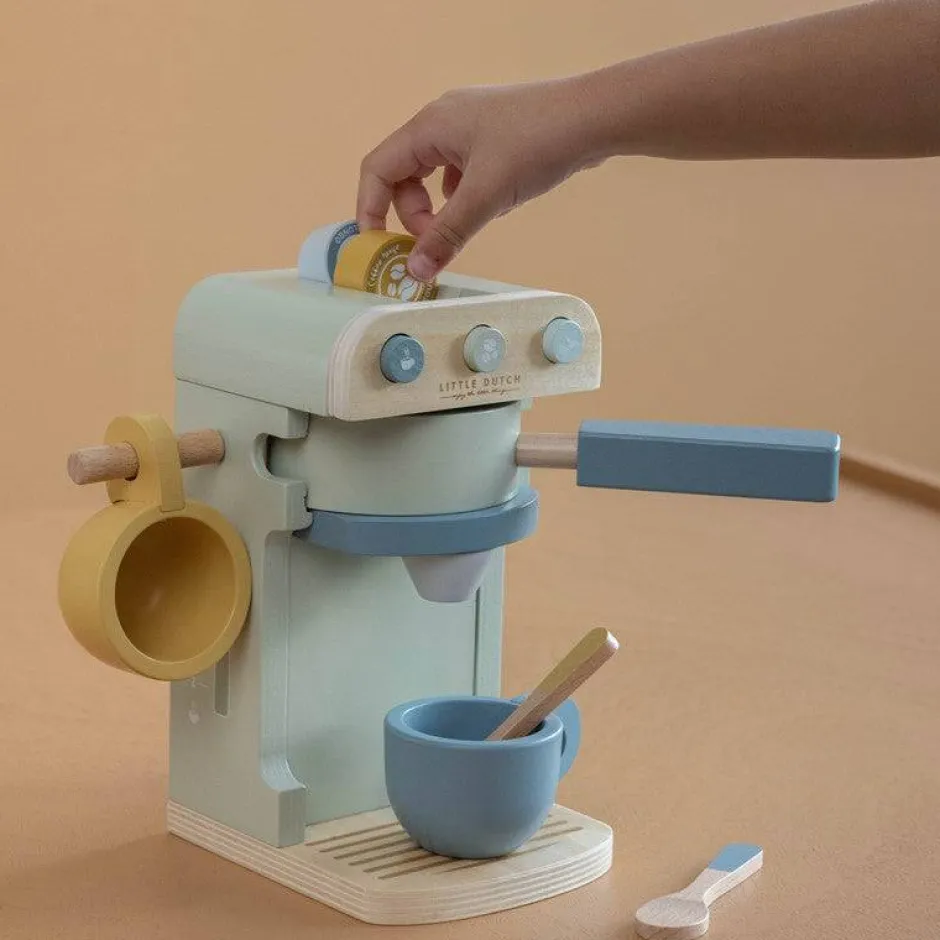 La cafetera de madera Little Dutch está disponible en color azul e incluye dos tazas, dos cucharas y cinco cápsulas de café en colores agradables: lungo, capuchino, café con leche, café y café espresso.