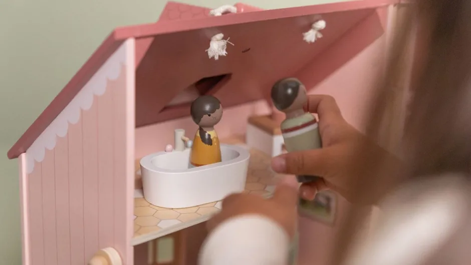 Esta familia es un conjunto de muñecos con clavijas de madera, formado por un padre, una madre, un hijo y una hija. Este conjunto de expansión es una gran set extra para la casa de muñecas de Little Dutch. Garantiza horas de diversión.