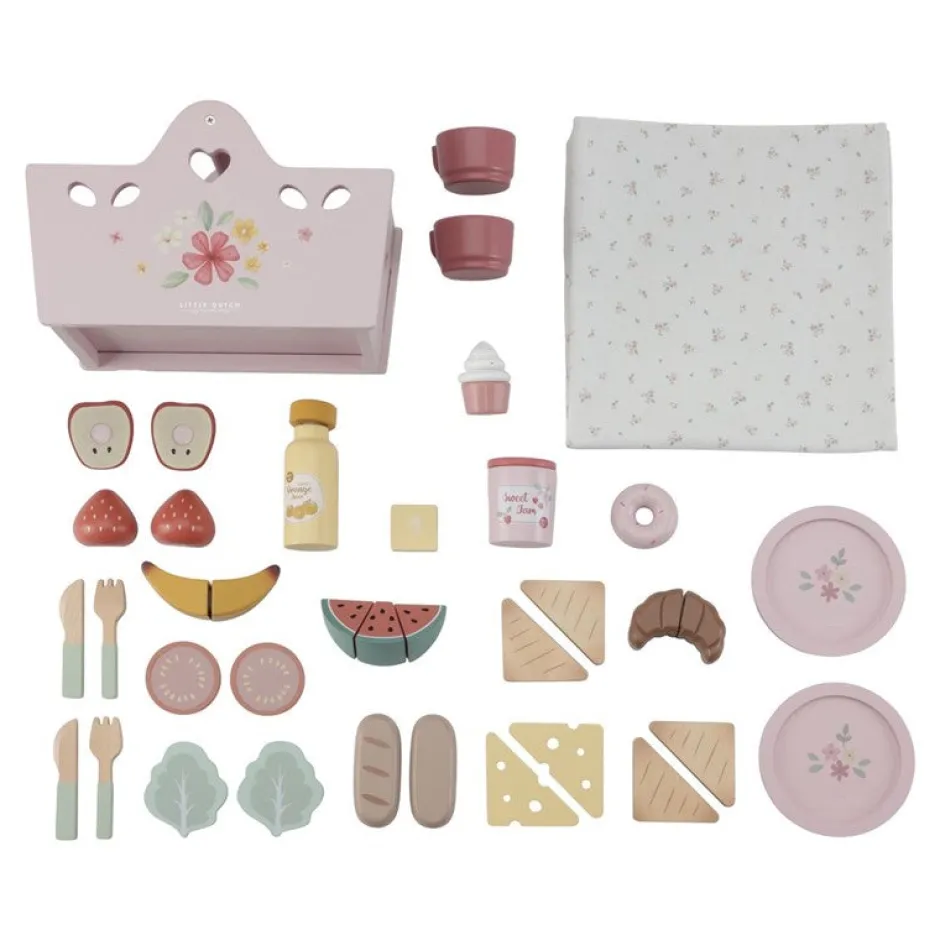 ¡Extiende tu manta de picnic y hagamos un picnic afuera! Todo lo que necesitas para un acogedor picnic al aire libre está en esta encantadora cesta de picnic rosa. Come un sándwich y cúbrelo con queso, tomate y lechuga. Disfruta compartiendo algunas frutas con tus amigos y tómate una taza de zumo de naranja.