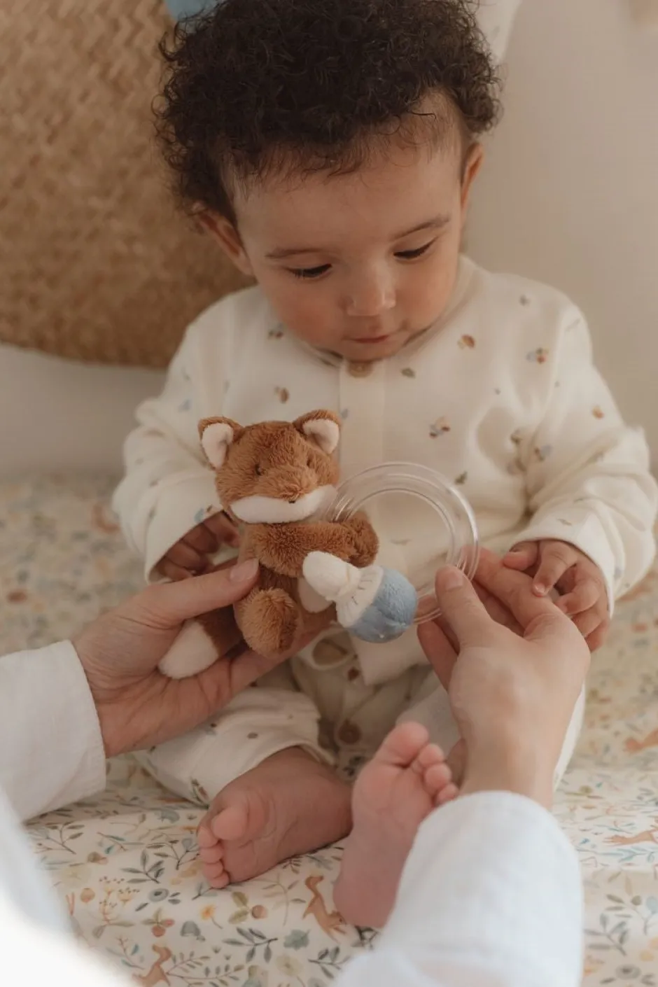 ¡Agarra, gira y sacude! El adorable zorro con su suave pelaje y su pequeña cola te invita a jugar y a poner en movimiento este sonajero. También ha elegido un pequeño hongo para que lo acaricies. El anillo transparente contiene 3 pequeñas cuentas de colores que empiezan a sonar cuando tu bebé juega con este divertido juguete. El sonajero no solo despierta la curiosidad y los sentidos de tu bebé, sino que también mejora la coordinación mano-ojo.