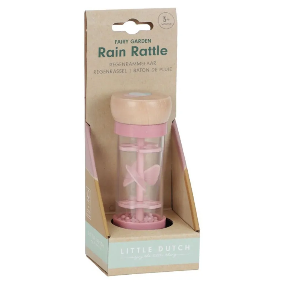 Dale la vuelta al sonajero de lluvia y las gotas se moverán hacia el otro lado haciendo suaves sonidos de gotas de lluvia.