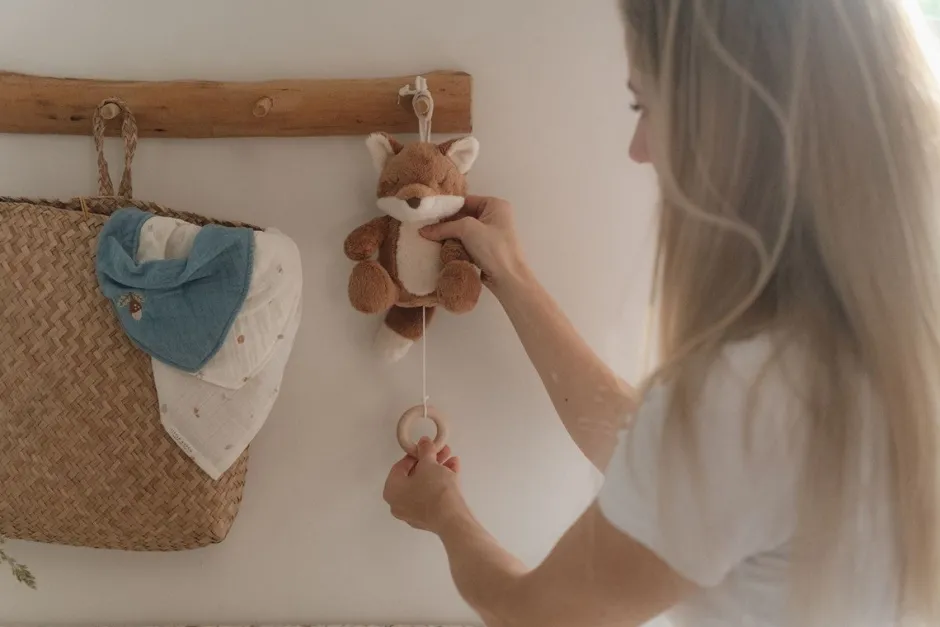 Dulces sueños! Este adorable zorro te guiará a un mundo de ensueño lleno de maravillas e imaginación. Mejora las rutinas para la hora de dormir con las encantadoras melodías de esta divertida caja de música. Baja el aro de madera y la relajante canción de cuna comenzará a sonar mientras tu pequeño se queda dormido. Un hermoso regalo y un encantador complemento para la decoración de la habitación del bebé.