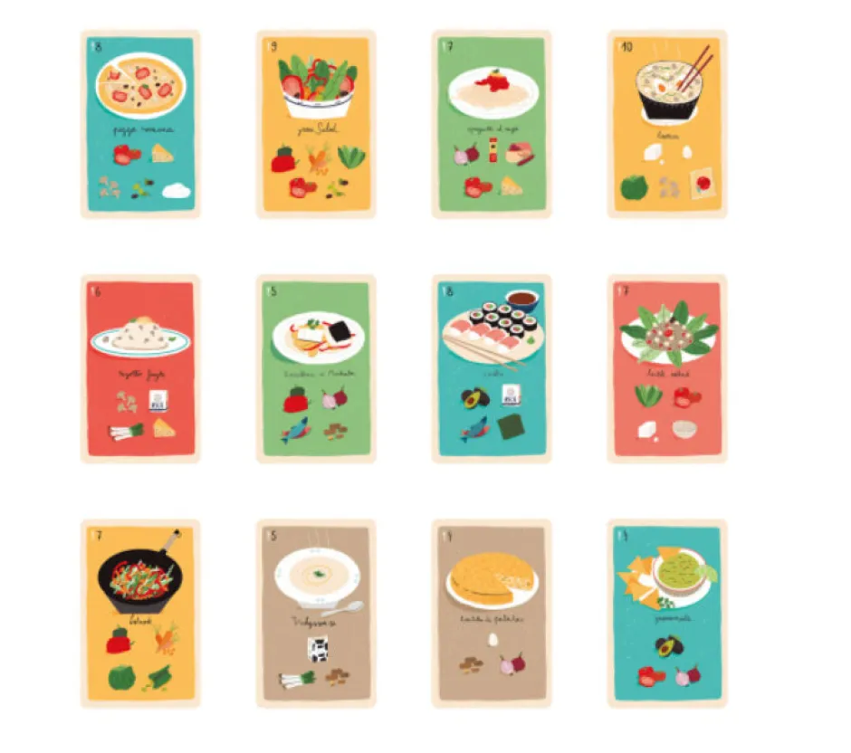 El juego incluye 17 cartas de recetas con platos de todo el mundo y 63 cartas de ingredientes.