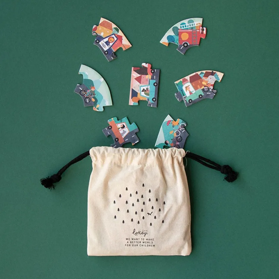 Un puzzle pequeño de 24 piezas y un juego de observación de coches y bicicletas en tamaño bolsillo, para llevarlo a todas partes. Fabricado con cariño en Barcelona.
