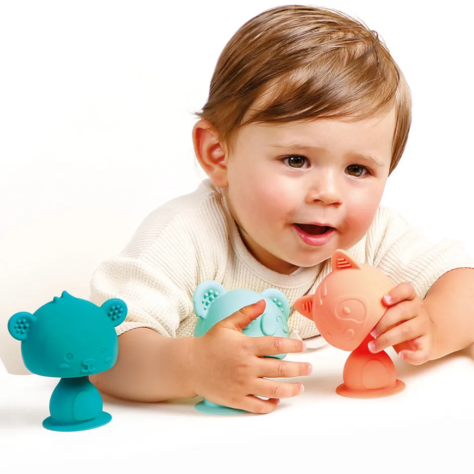 ¡El koala, el mono y el mapache están listos para animar las comidas y los juegos del bebé! Gracias a sus ventosas, estas simpáticas criaturitas se adhieren en un instante a cualquier superficie lisa: mesa, trona, bañera o incluso azulejos.
