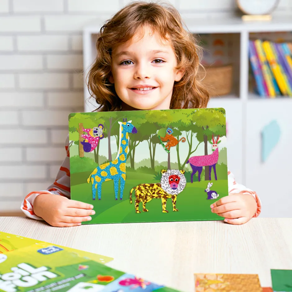 Manualidad ideal para que tus hijos se diviertan mientras desarrollan su creatividad, ¡y todo sin ensuciar! Esta actividad mejora la motricidad fina, refuerza la coordinación mano-ojo y les permite crear increíbles diseños. Solo tienen que pegar los papeles brillantes sobre las pegatinas y colocarlas en los fondos para dar vida a auténticas obras de arte.