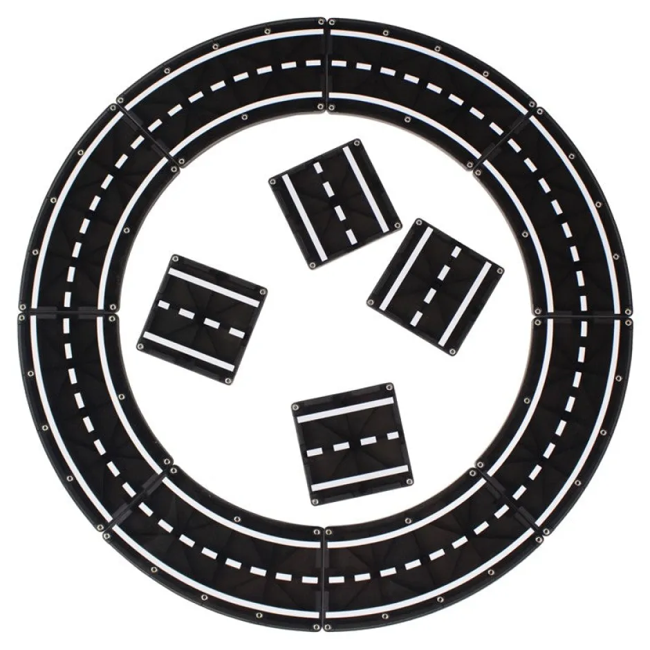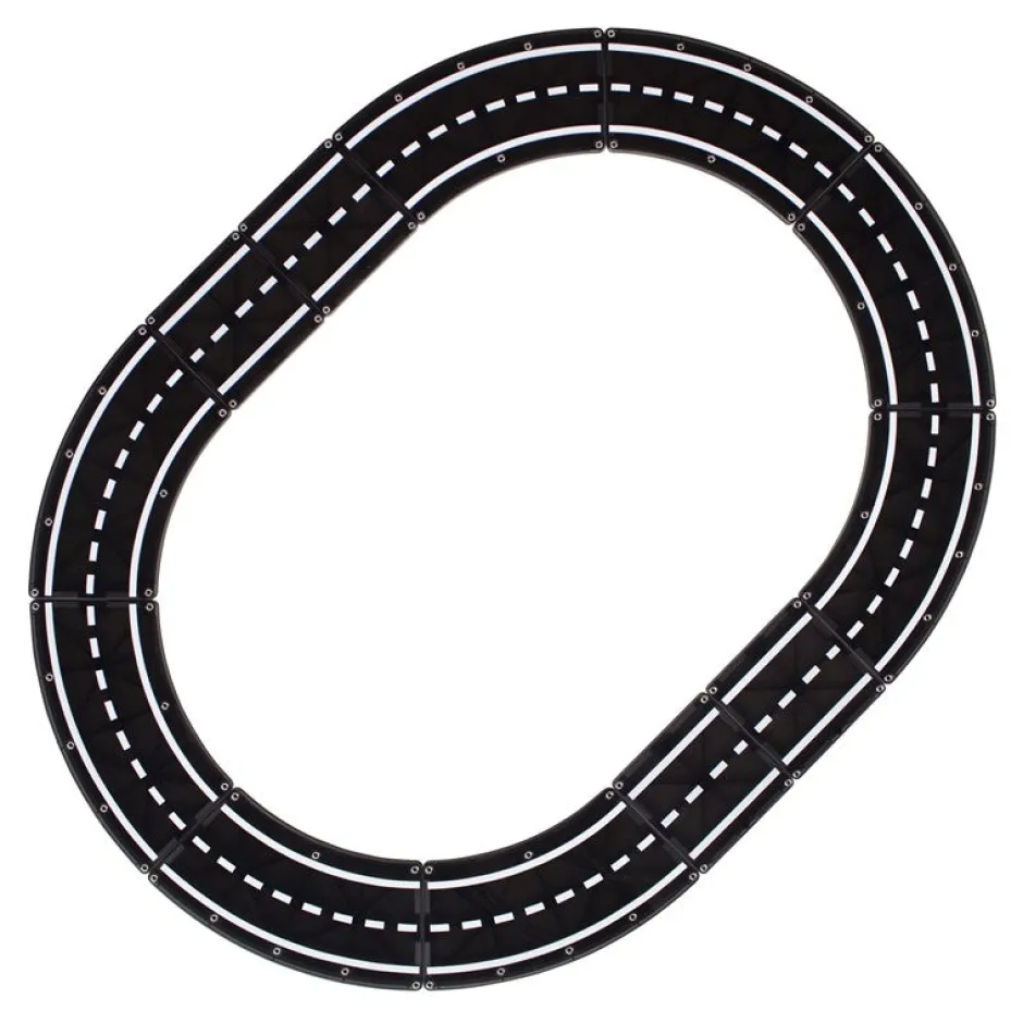 Incluye todas las piezas que necesitas para completar un círculo perfecto (8 Curvas) o una pista de carreras ovalada (8 Curvas + 4 Cuadradas).