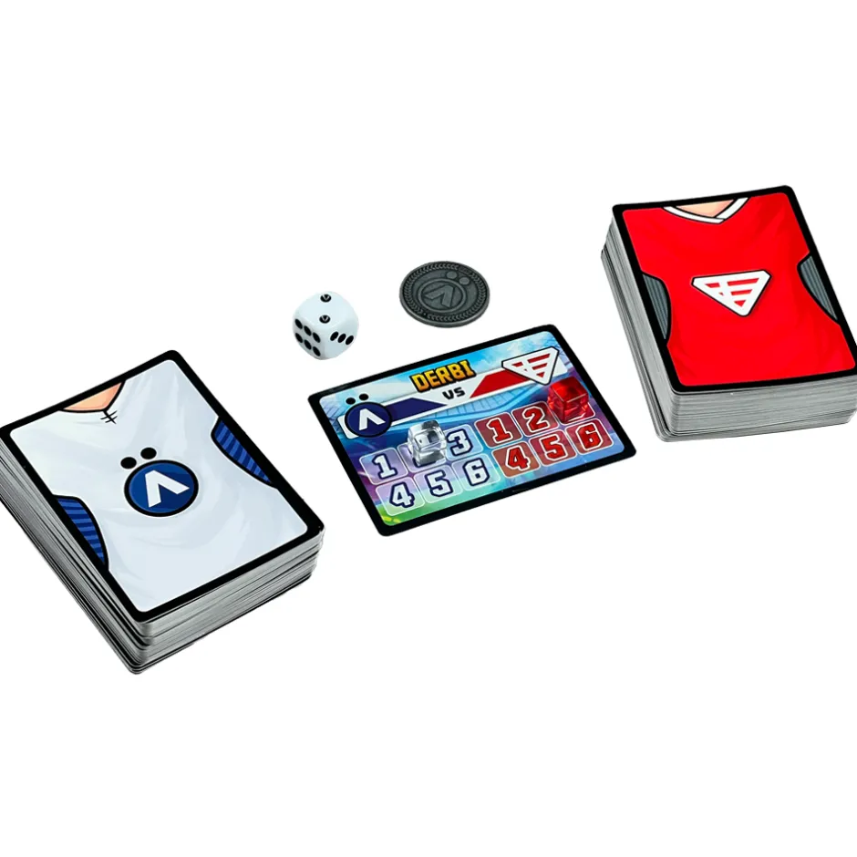 Derbi recrea la tensión y diversión de un partido de fútbol en muy poco tiempo, con unas reglas sencillas y con solo cartas y un dado.