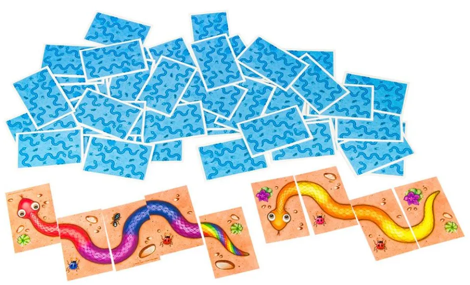 Rojo con rojo, verde con verde, amarillo con…¡el comodín arco iris! ¡Hay que ordenar los colores de la serpiente! La clave en Serpentina es completar las serpientes con cabeza, cuerpo y cola para poder llevárnosla a nuestro montón.