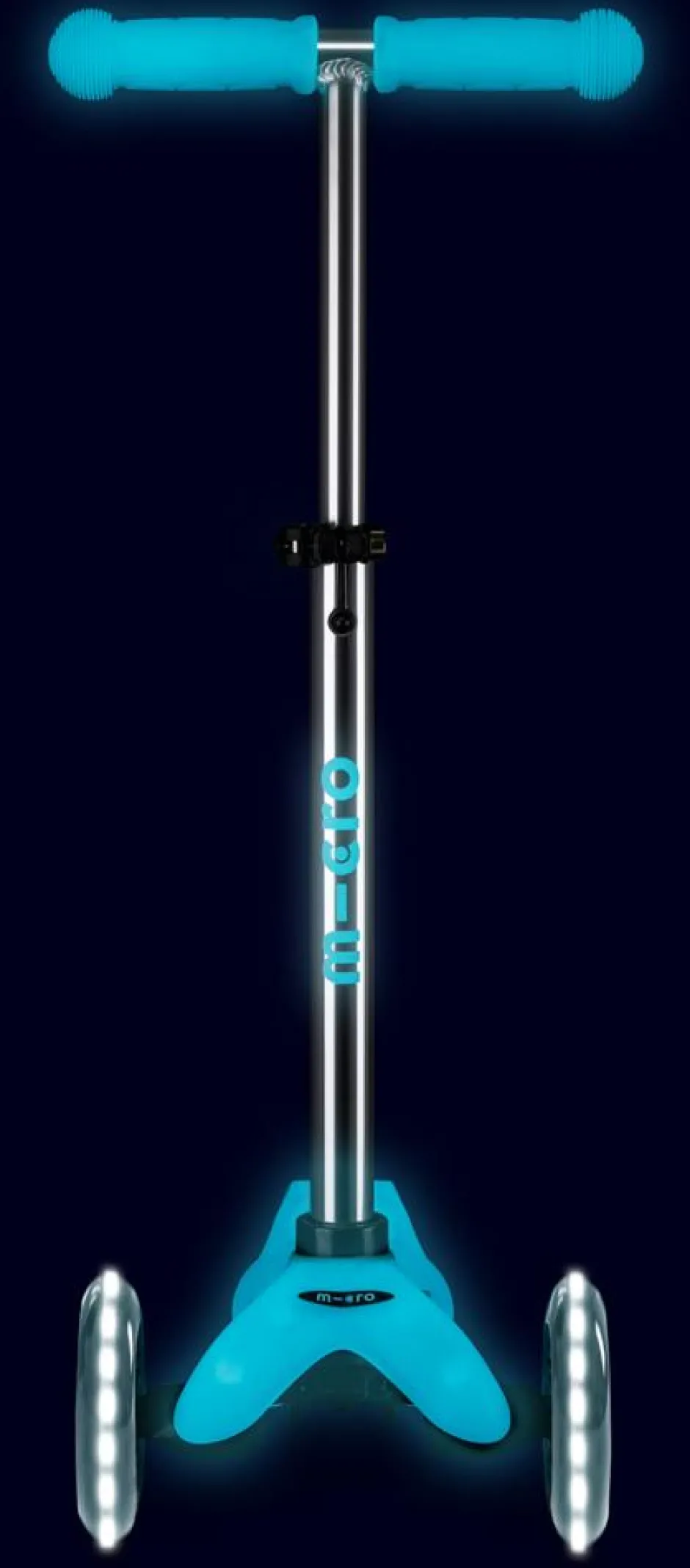 El Mini Micro ha sido elegido numerosas veces juguete del año por padres y madres. Este juguete deportivo no solo fomenta el movimiento y el ejercicio, sino que también ayuda a los niños a mejorar el equilibrio, la coordinación y las habilidades motoras finas. El manillar diseñado en forma de T hace más segura su conducción y dispone de un cierre de seguridad que hace que solo los adultos puedan desmontarlo para guardarlo. Dispone de un sistema de giro por inclinación patentado. La plataforma está fabricada con fibra de vidrio lo cual le otorga resistencia y flexibilidad. Además incluye letras de goma en relieve que son antideslizantes facilitando el manejo del patinete y dando seguridad extra a nuestros pequeños. Incorporan unas ruedas LED que funcionan a través de una dinamo, por lo que no requieren de baterías, sino que funcionan solo cuando nos movemos. Emiten una brillante luz blanca que, además de ser divertida para nuestros pequeños, les da seguridad al ser vistos con mayor facilidad en momentos de oscuridad. Por ultimo y en absoluta primicia, tanto la plataforma como los puños y el logo del manillar brillan en la oscuridad. La luz ultravioleta del ambiente diurno carga esos componentes y al llevarlos a la oscuridad hacen que el patinete que de dia tiene un tono pastel adquiera un tono neon brillante