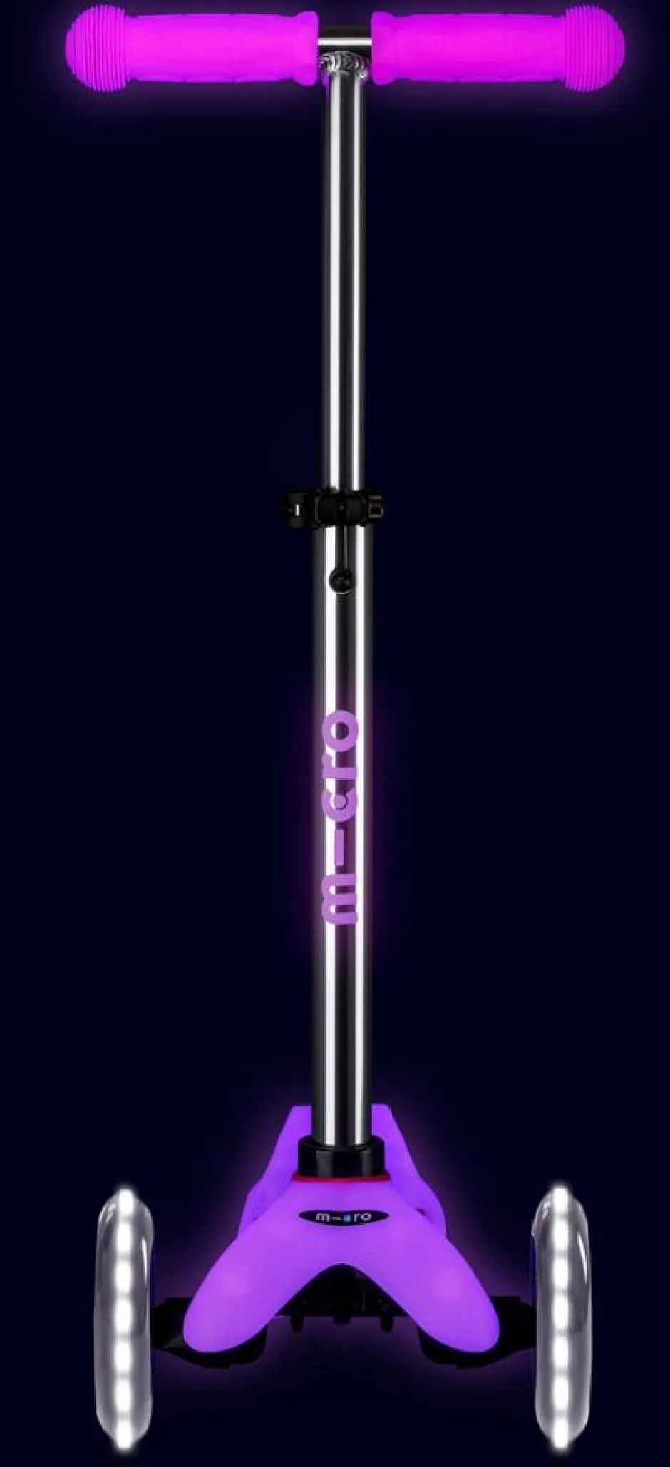 El Mini Micro ha sido elegido numerosas veces juguete del año por padres y madres. Este juguete deportivo no solo fomenta el movimiento y el ejercicio, sino que también ayuda a los niños a mejorar el equilibrio, la coordinación y las habilidades motoras finas. El manillar diseñado en forma de T hace más segura su conducción y dispone de un cierre de seguridad que hace que solo los adultos puedan desmontarlo para guardarlo. Dispone de un sistema de giro por inclinación patentado. La plataforma está fabricada con fibra de vidrio lo cual le otorga resistencia y flexibilidad. Además incluye letras de goma en relieve que son antideslizantes facilitando el manejo del patinete y dando seguridad extra a nuestros pequeños. Incorporan unas ruedas LED que funcionan a través de una dinamo, por lo que no requieren de baterías, sino que funcionan solo cuando nos movemos. Emiten una brillante luz blanca que, además de ser divertida para nuestros pequeños, les da seguridad al ser vistos con mayor facilidad en momentos de oscuridad. Por ultimo y en absoluta primicia, tanto la plataforma como los puños y el logo del manillar brillan en la oscuridad. La luz ultravioleta del ambiente diurno carga esos componentes y al llevarlos a la oscuridad hacen que el patinete que de dia tiene un tono pastel adquiera un tono neon brillante