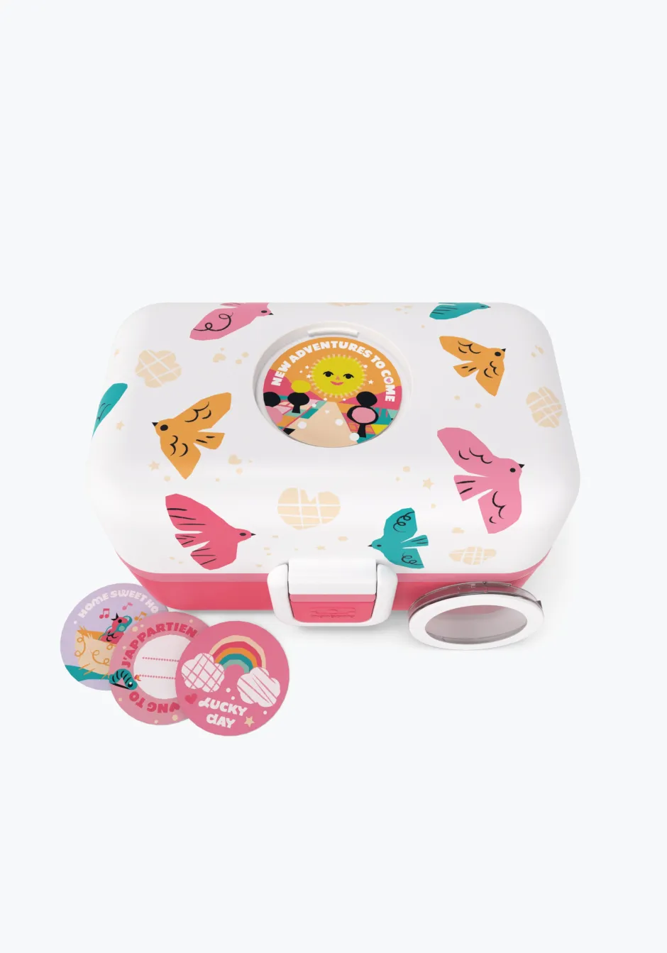 Escuela, sala de juegos, al aire libre, salidas escolares: esta fiambrera se lleva a todas partes… ¡mientras protege el contenido de las locas aventuras de los mini comilones nómadas!