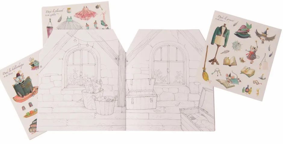 Un mfantástico libro para colorear con 160 pegatinas para decorar. Todo un hogar en un libro, 8 habitaciones diferentes dibujadas en blanco y negro que conforman un acogedor hogar para revelar en compañía de los revoltosos ratoncitos.