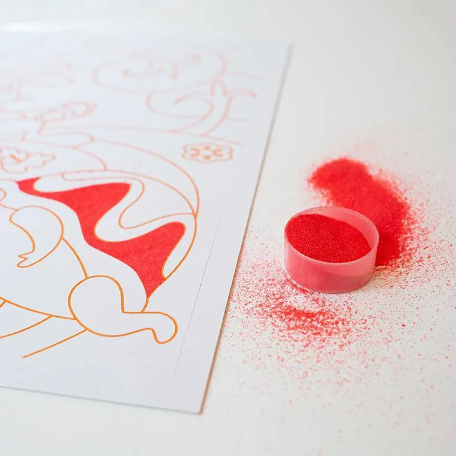 Simplemente retira la superficie protectora precortada y espolvorea sobre ella los diferentes colores. Con cada color, las ilustraciones cobrarán vida y se convertirán en una verdadera obra maestra.