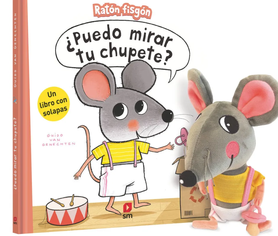 Un pack que contiene el libro ¿Puedo mirar tu chupete? y un muñeco del Ratón fisgón.