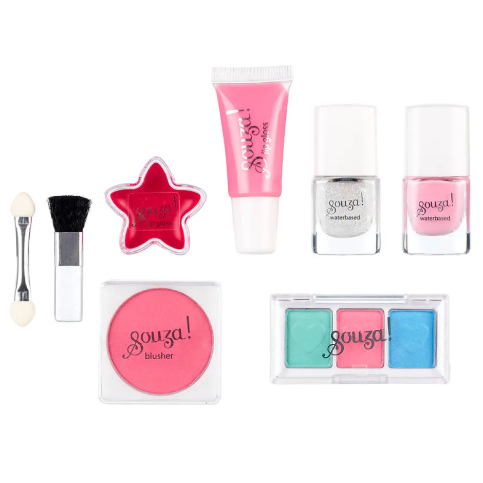 ¡Sorpresa! Este estuche con forma de castillo tiene 8 puertas con distintos productos de maquillaje: 2 esmaltes de uñas, 3 sombras de ojos, 2 brillos de labios, colorete y dos aplicadores.