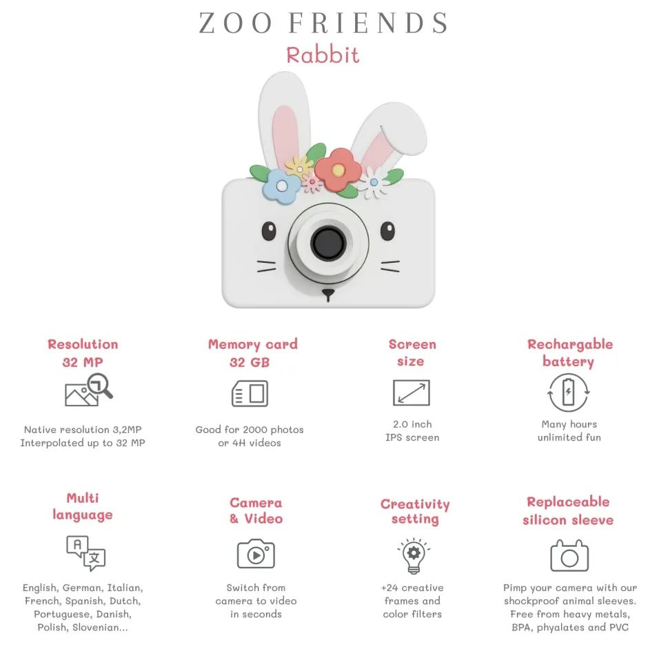 La Zoo Friends es una cámara digital con forma de animalitos ideal para los niños. Su cálida carcasa de silicona les anima a hacer fotos. La cámara está diseñada ergonómicamente para que las manos de los más pequeños puedan sujetarla y manejarla con facilidad.