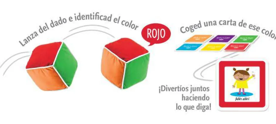 El juego contiene un dado de tamaño grande y blandito con un bolsillo para guardar las tarjetas de acciones.