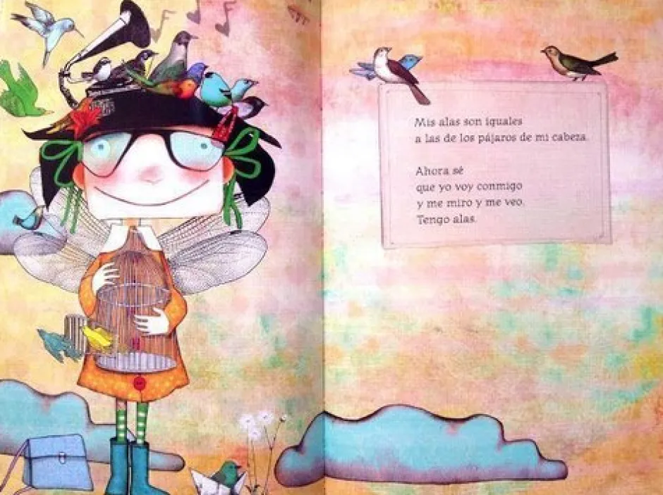 A una niña le gusta un niño, pero el niño no se fija en ella, no la mira. ¿Qué hacer? Sus amigos le aconsejan de todo: que se quite las coletas, las gafas, la sonrisa, las pecas, las alas, que no sea tan parlanchina. El niño por fin se ha fijado en ella, pero, con tanto quitar, hasta se han ido los pájaros de su cabeza. Y la niña se da cuenta de que ya no es ella y decide recuperar sus coletas, sus gafas, su sonrisa, sus pecas, sus alas, sus palabras…