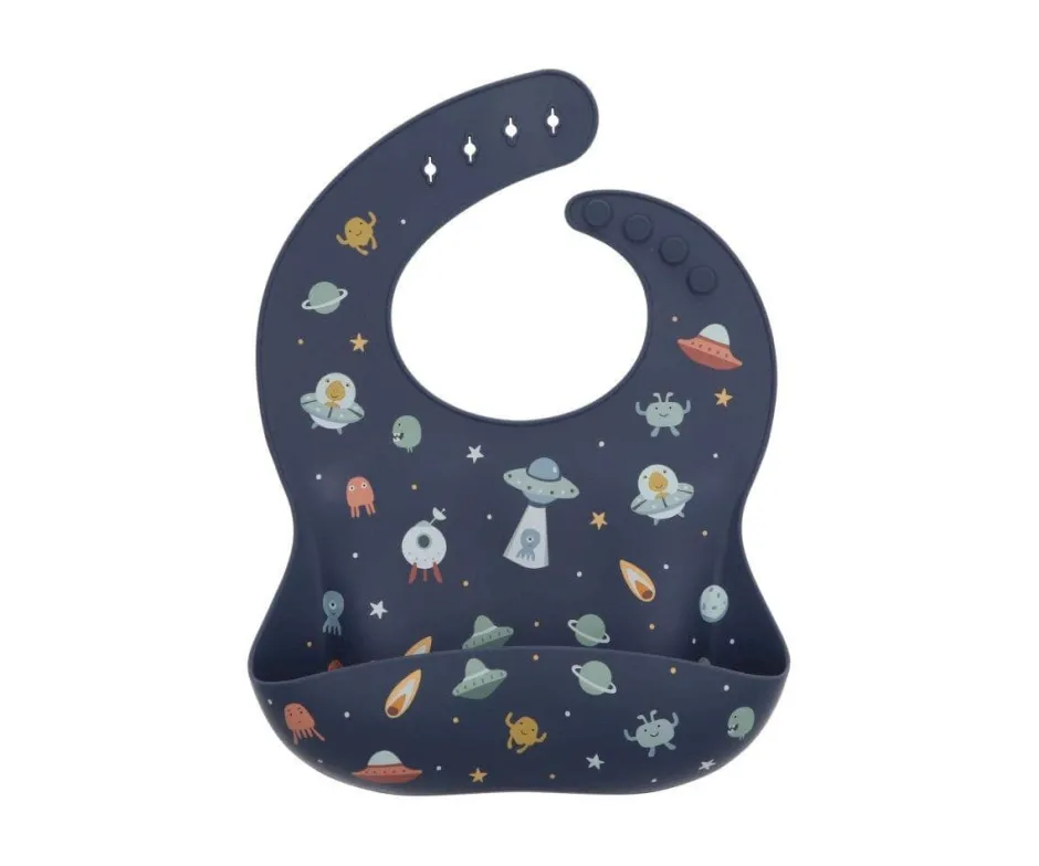 Babero de silicona con un bolsillo recogemigas para evitar que caiga la comida a la ropa.
