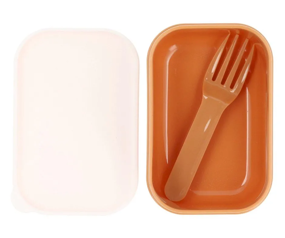 Esta pequeña cajita de fruta con tenedor, está pensaba para meter dentro de otra caja de almuerzo más grande y llevar la fruta o pequeños snacks separados del resto de almuerzo.