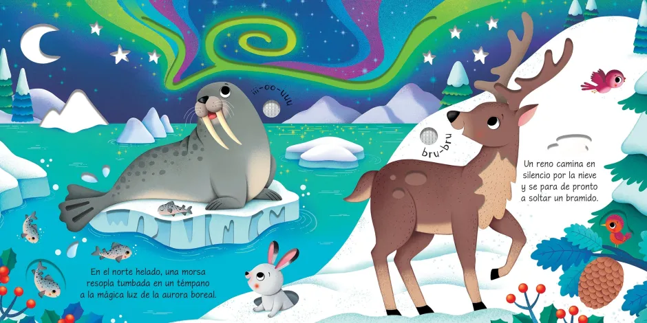 Además de sonidos y magníficas ilustraciones, hay agujeros por los que mirar, ranuras que repasar con el dedo y diferentes texturas para captar la atención de los pequeños y estimular sus sentidos.