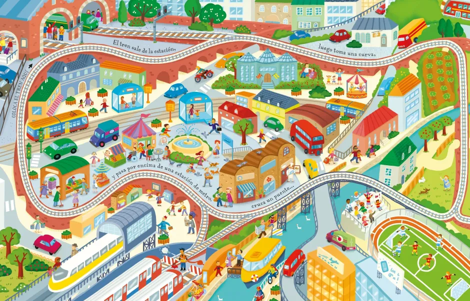Libro y juguete en uno. Este libro de cartón de gran tamaño incluye un tren de vapor que circula por la vía. Los niños solo tendrán que darle cuerda y colocarlo sobre las vías para ver cómo atraviesa la ciudad, las montañas y los ríos hasta llegar al museo ferroviario. Hay cuatro vías incrustadas en las páginas, que se pueden utilizar por separado o encajarlas para construir una vía de tren gigante.