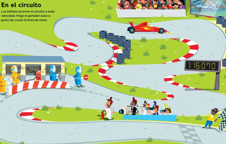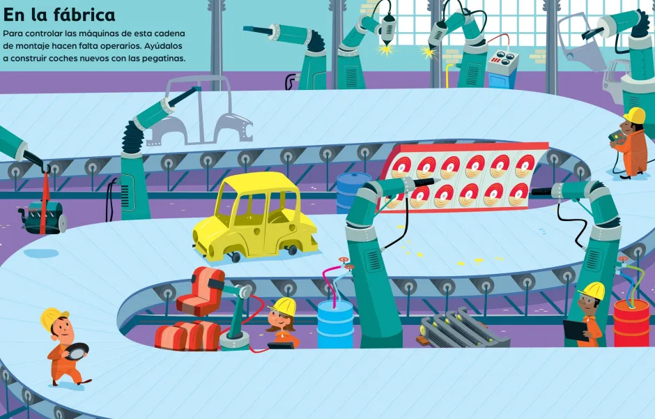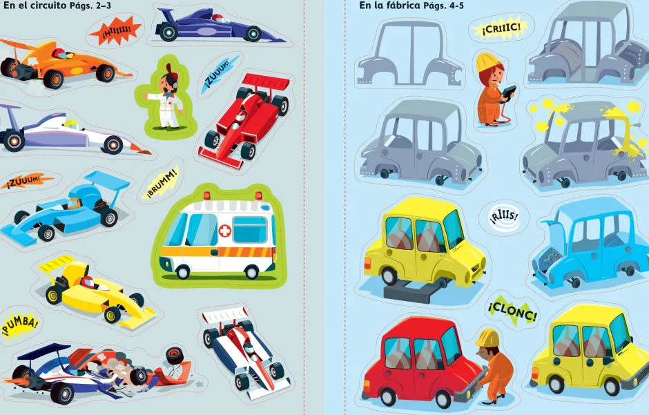 Los apasionados por los coches disfrutarán mucho con este libro donde tendrán que añadir decenas de pegatinas sobre ajetreadas escenas que incluye un circuito de carreras, una ciudad bulliciosa y una fábrica de coches. Incluye una página especial donde aparecen diversos coches a lo largo de la historia.