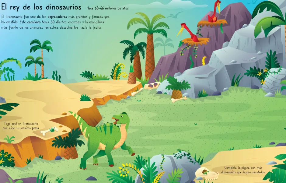 Un fantástico libro de pegatinas con escenas de hábitats prehistóricos a las que los peques podrán dar vida con gigantes y gentiles herbívoros como el Brachiosaurus, enormes criaturas voladoras o colosales carnívoros, como el T. Rex.