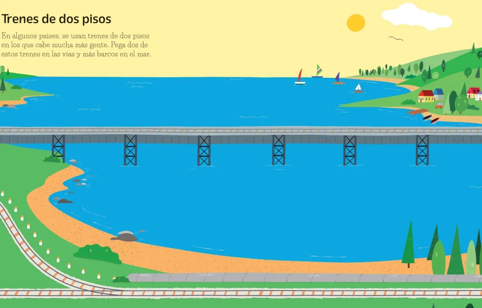 ¡Todos a bordo! Este libro trae más de 150 pegatinas diversas para que los pequeños den vida a las escenas representadas. Hay pegatinas dedicadas por entero a los diferentes trenes que existen, como de dos pisos, de vapor, de mercancías, monorraíles. Y otras muchas pegatinas con las que los niños podrán crear su propia locomotora.