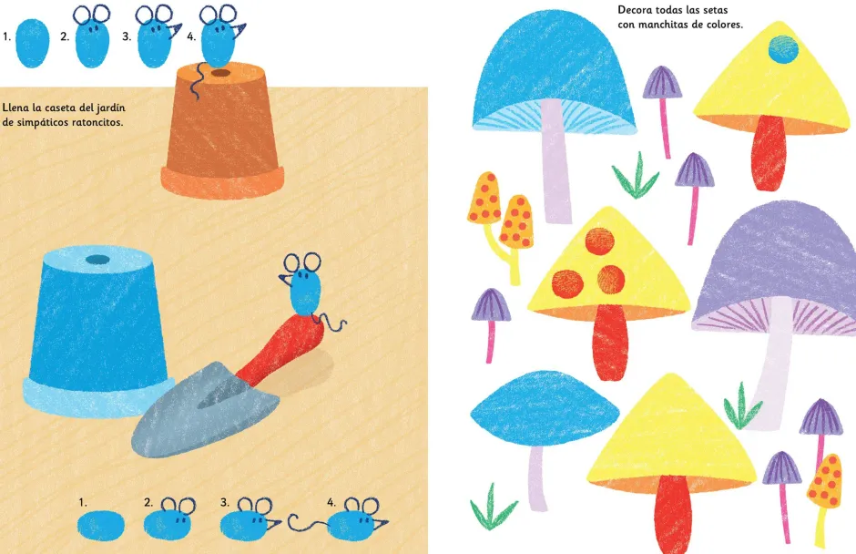 Con almohadillas de tinta de siete colores en la que mojar los dedos y muchísimas ideas explicadas paso a paso, los más pequeños podrán dar rienda suelta a su creatividad decorando preciosas escenas.