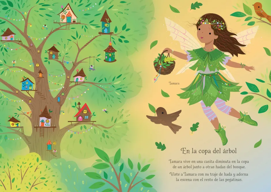 Un mágico libro de pegatinas lleno de hadas para vestir y escenas para decorar. Con más de 200 pegatinas de complementos de ropa y de elementos naturales o de diferentes criaturas que pueblan las copas de los árboles de este mundo mágico y feérico.