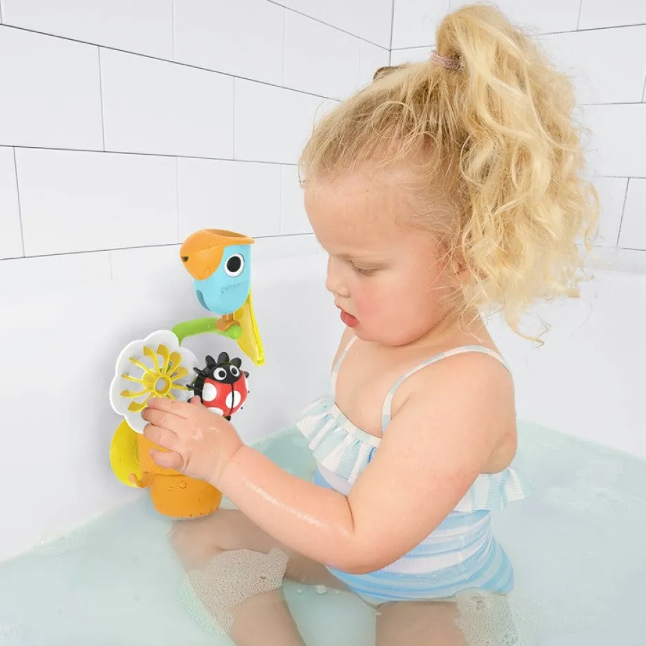 Pon agua dentro del pajarito azul, el pajarito picará hacia adelante regando la flor y de la maceta saldrá una mariquita.