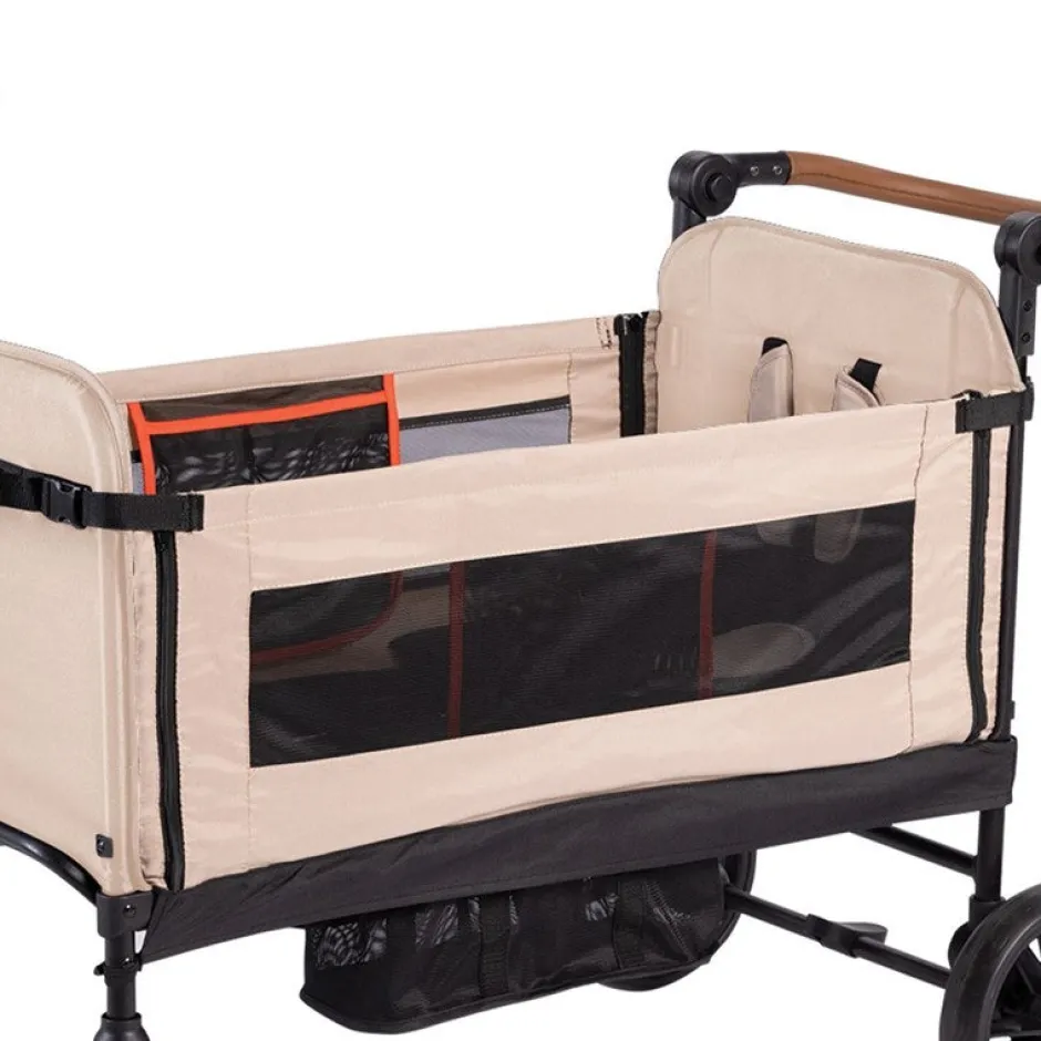Completamente plegable, capota con protección rayos ultra violetas. Dentro del espacio hay dos bolsillos para almacenar juguetes o snacks. Lleva un hueco debajo del marco para apoyar los pies/ piernas para mayor comodidad.