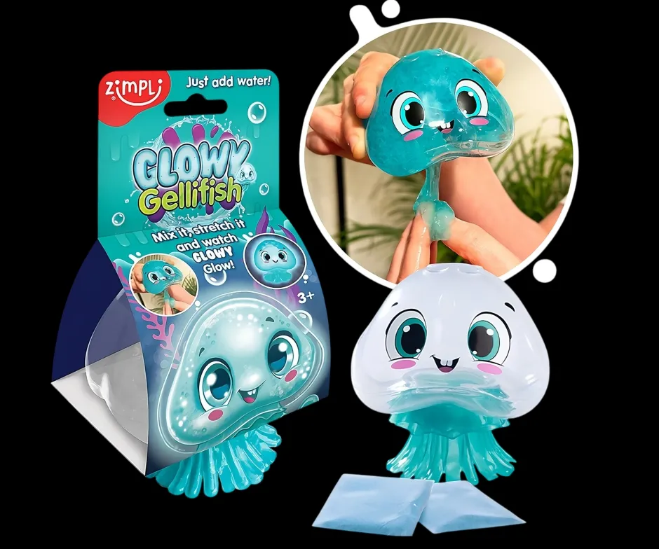 Mézclalo, extiéndelo y mira cómo brilla! Vierte el polvo de slime Glow In The Dark dentro de tu medusa, añade un poco de agua, agítalo y deja que se forme el slime.
